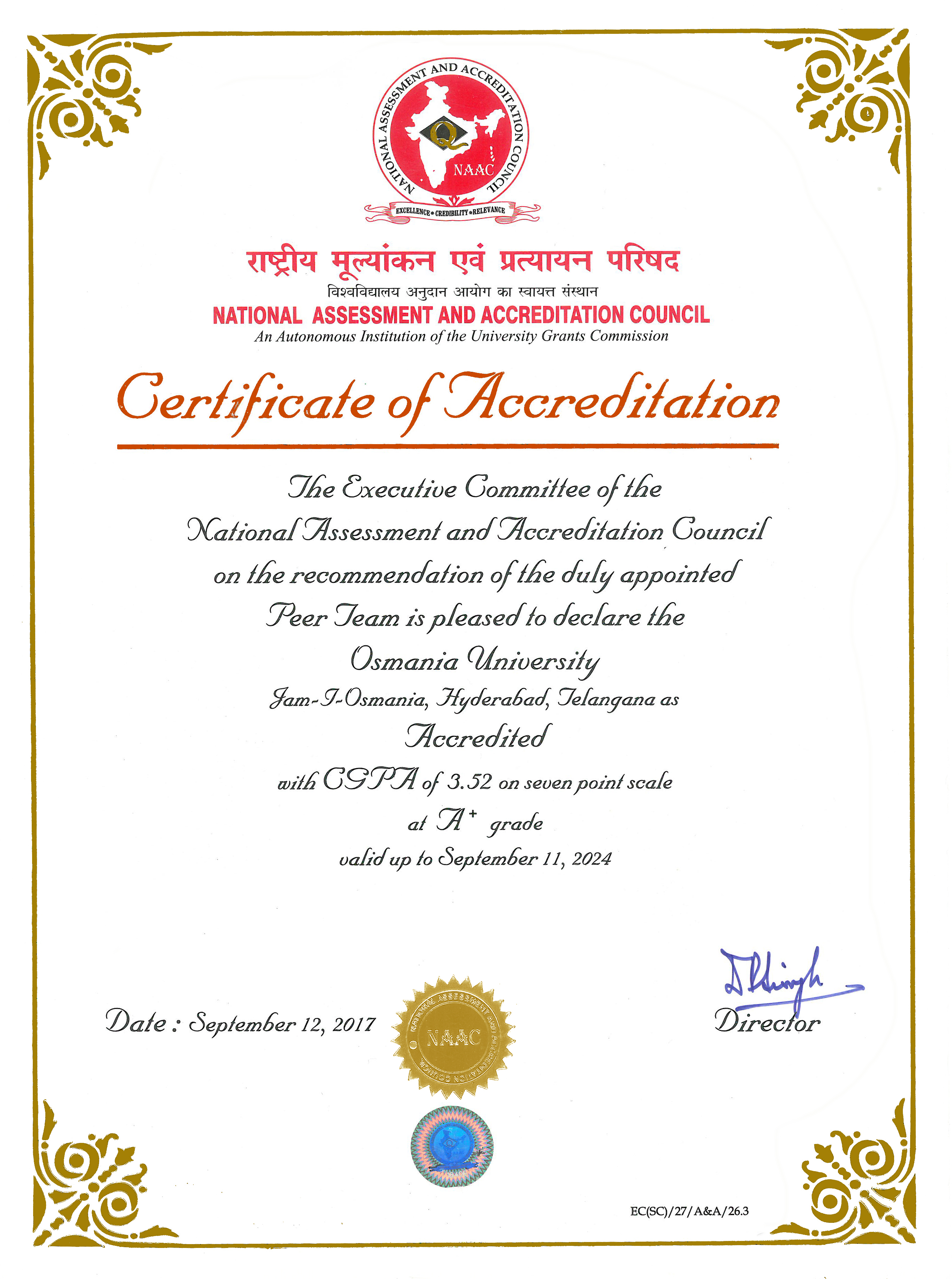 Osmania University, guided by its vision and mission, nurtures globally competitive skills among the students with a quest for excellence, meeting the benchmarks of international standards of Higher Education. Further, the University continuously strives to address the national concerns on the quality and relevance of the higher education by evaluating its strengths and weaknesses in curriculum, teaching, learning, evaluation, research, infrastructure development, and governance. In the past, the University has volunteered for 'Assessment and Accreditation' with the National Assessment and Accreditation Council (NAAC) during 2001 and 2008. In the two previous accreditations, the University was graded with highest rating due to the untiring efforts of all the stakeholders over the years. The University with its achievements and challenges could continuously out perform its competitors.